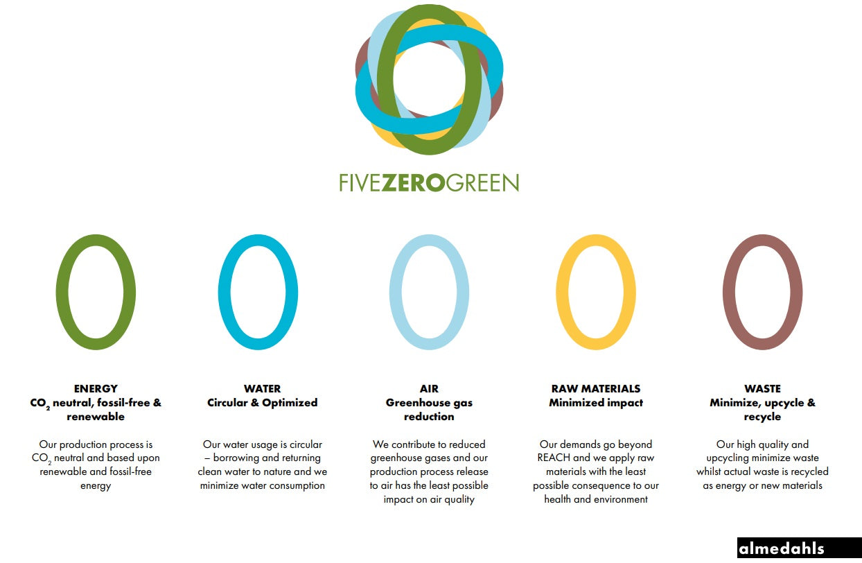 Almedahls was a pioneer in adopting environmental protection and sustainability practices. They now operate one of the greenest supply chains in the industry. Their commitment to a cleaner future is exemplified by their Five Zero Green program, a set of five key sustainable processes that ensure the environmental responsibility of their products.